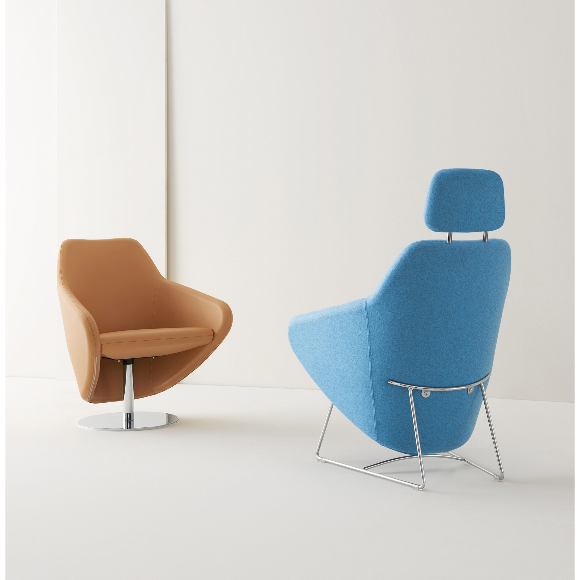 Taxedo , ein vielseitiger kleiner Sessel in einem langen Kleid. Wählen Sie Pulverbeschichtung oder Chrom für eine fest geerdete Stahlstangenschlittenbasis. eine drehbare drehbare Stahlbasis; oder eine schwankende Chromstange und eine Massivholz-Schaukelbasis. In jeder Umgebung sorgen Taxidos geformter Sitz und das umhüllende Rückenlehnendesign für einen bequemen Sitz mit oder ohne Kopfstütze.
