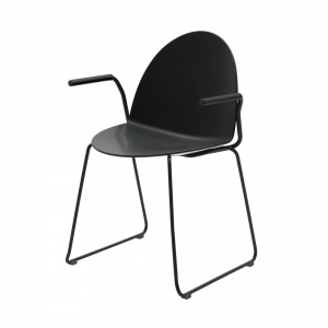 Stuhl / Armlehnstuhl stapelbar Kufengestell aus Massivstahl Ø 12mm epoxydlackiert oder verchromt. Gleiter: Kunststoff. Armauflage aus Polyethylen, Farbe Schwarz für Sitz-Schale Schwarz, Farbe Hell-Grau für alle andere SitzSchalen Sitzschale aus recyclefähigem Polypropylen. Polypropylen Abdeckungschutz unter dem Sitz. Sitzschale gepolstert mit Stoffbezug